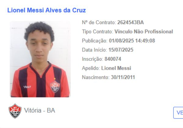 O torcedor do Vitória que consultou o Boletim Informativo Diário (BID) da CBF nesta sexta-feira (1º) certamente levou um susto ao ver um nome de peso no registro: Lionel Messi. Mas, apesar da semelhança impressionante, não se trata do craque argentino oito vezes eleito o melhor jogador do mundo.
